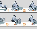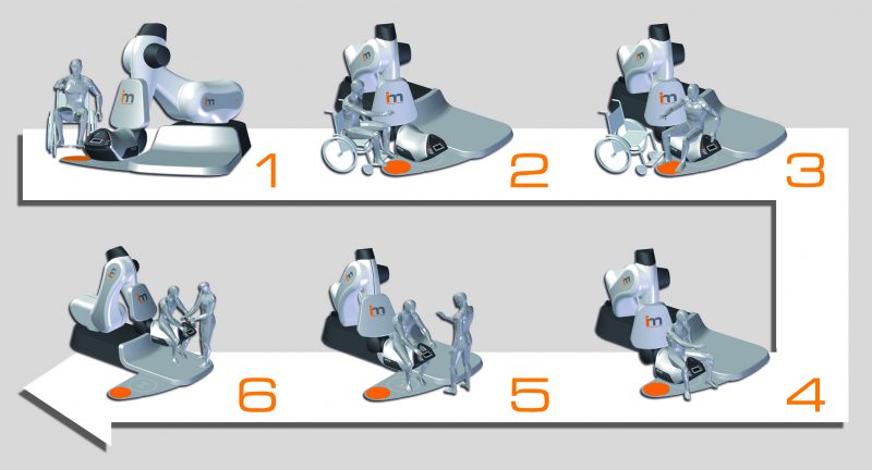 Při nasedání pacienta se robot nastaví do polohy vhodné k nasednutí, v níž lze pacienta bez námahy a bezpečně zvednout z kolečkového křesla a usadit jej na sedlo robota. Oporu při otáčení sedadla s pacientem zajišťuje otočná plošina, která je součástí základny zařízení.